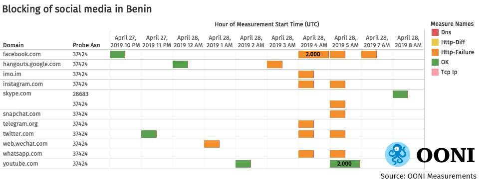 Most measurements were collected from the mobile operator Spacetel (AS37424), locally known as MTN Benin, and consistently showed that the testing of the following social media sites presented HTTP failures: facebook.com, whatsapp.com, telegram.org, twitter.com, instagram.com, skype.com, snapchat.com, imo.im, hangouts.google.com, web.wechat.com. Youtube though remained accessible throughout the elections.
