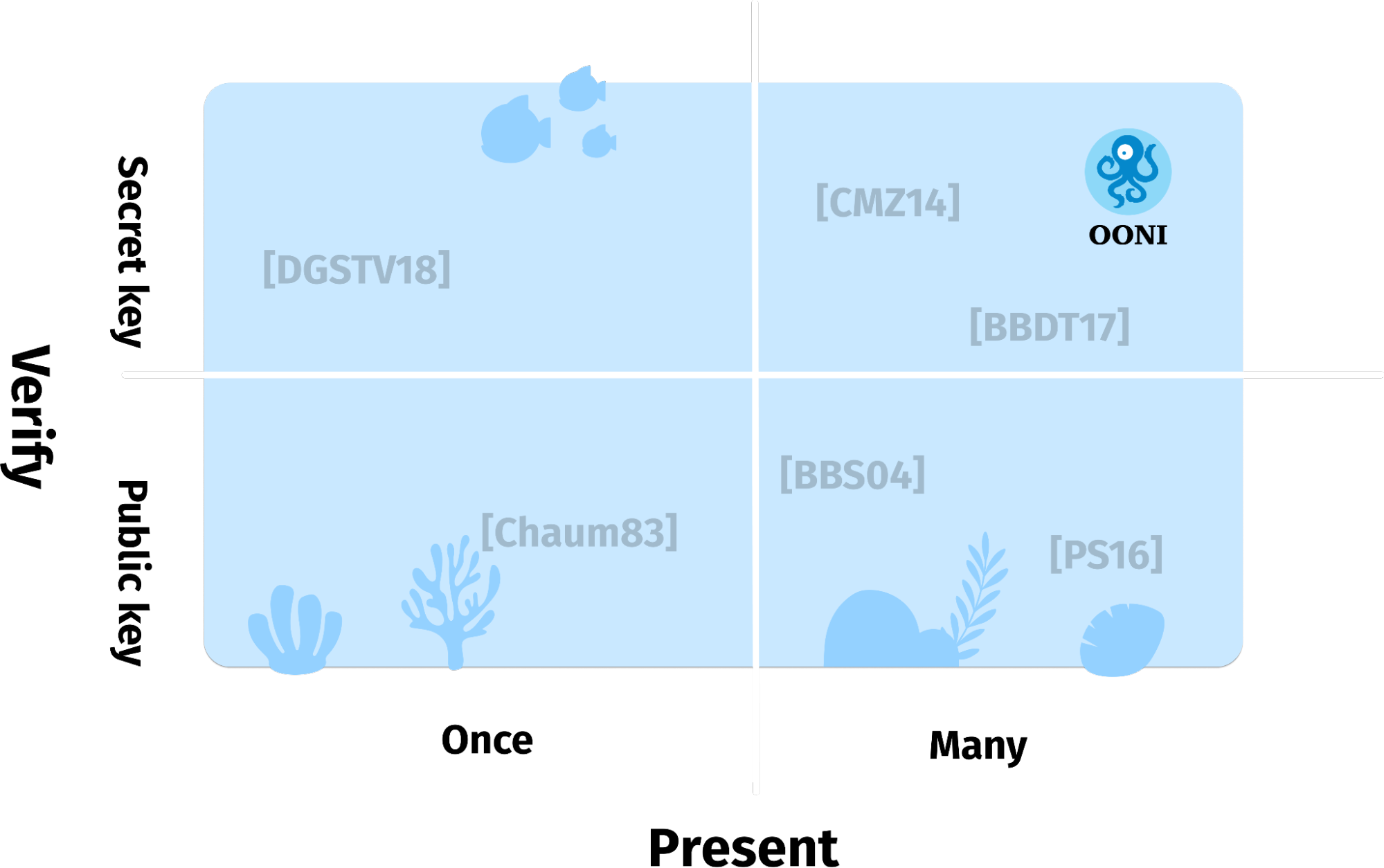 Image: An overview of the landscape of anonymous credentials in theoretical cryptography, with OONI’s positioning.
